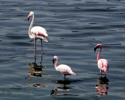 Then there are my beautiful flamingo friends. They are so graceful as they walk through the maji (water) to find algae and brine shrimp to eat. The big ones are called Greater Flamingos and their shorter brothers are called Lesser Flamingos. You can even tell by their beaks who’s who. The Greater Flamingos have pink beaks with black tips and the Lesser Flamingos have dark red beaks.
